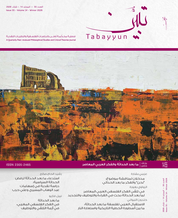 The Arab Center for Research and Policy Studies and the Doha Institute for Graduate Studies have released the 55th issue of the quarterly peer-reviewed journal Tabayyun, dedicated to Philosophical Studies and Critical Theory. This special issue is titled “Postmodernism and Contemporary Arab Thought” and contains the following studies: “Two Perspectives On ‘US’ and Postmodern Thought”, by Azmi Bishara; “On the Reception of Postmodernism in Contemporary Arab Philosophical Thought: An Inquiry into Interpretation, Appropriation, and Renewal”, by Zouaoui Beghoura; “Postmodern Philosophy in Arab Thought: The Myth of Historical Linearity and the Metaphor of Fire”, by Khaldoun Nabwani; “The Invocation of Postmodernism in the Rejection of Political Modernity: A Critical Study of the Contributions of Abd al-Wahhab al-Messiri and Ali Harb”, by Rasheed Alhaj Saleh; and “Postmodernism in Moroccan Philosophical Thought: On the Crisis of Reception and Application”, by Nabil Fazio. In addition to the special issue articles, Tabayyun 55 features Rachid Benbih’s study “Edward Said and Wael Hallaq: Overlooked Questions in Postcolonial Studies”, and Omar Almagharebi’s translation of “The Negativity Crisis of AI Ethics” by Peter Königs.. The reviews section contains two book reviews: Khaled Qutb’s review of Fashionable Nonsense: Postmodern Intellectuals’ Abuse of Science by Alan Sokal and Jean Bricmont, and Hamdi Abdel Hamid El Sherif’s review of The Main Enterprise of the World: Rethinking Education by Philip Kitcher. The issue concludes with four overviews of recent publications prepared by the editorial board.